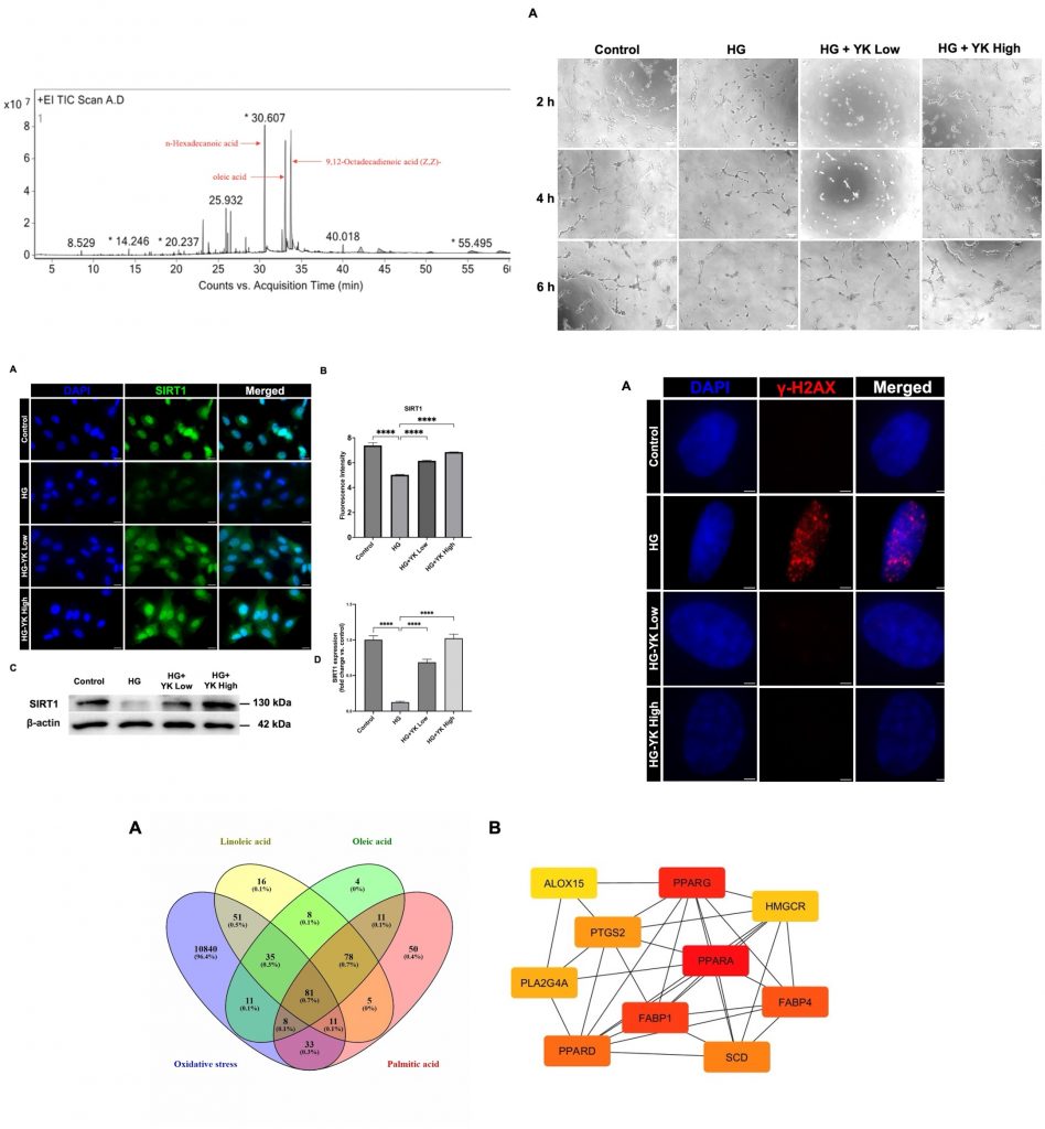 Diabetes can damage blood vessels over time. One major cause is high blood sugar, which increases harmful molecules called reactive oxygen species (ROS). These molecules lead to oxidative stress, weaken blood vessel cells, and can result in serious complications. A protective protein called SIRT1 helps reduce this damage, but its levels are often lower in people with diabetes. This study explored whether an extract from brown Yar Ko (YK) rice, a traditional rice from southern Thailand, could protect blood vessel cells from damage caused by high sugar levels. Researchers tested the extract in human endothelial cells grown in the lab under diabetic-like conditions. The results showed that YK rice extract contains beneficial natural compounds, including fatty acids and antioxidants. These compounds helped reduce oxidative stress by lowering ROS levels and decreasing damage to cellular DNA. The extract also improved the function of endothelial cells, helping them maintain their normal structure and ability to form blood vessels. Importantly, YK rice extract increased the levels of SIRT1, a key protein that supports antioxidant defenses and cell health. Further analysis suggested that this effect may involve additional pathways linked to energy metabolism and protection against oxidative damage. In summary, brown Yar Ko rice extract shows potential as a natural approach to protect blood vessels from diabetes-related damage. However, more studies are needed to confirm these effects in humans.